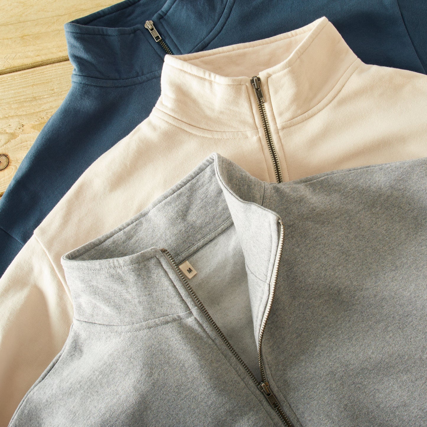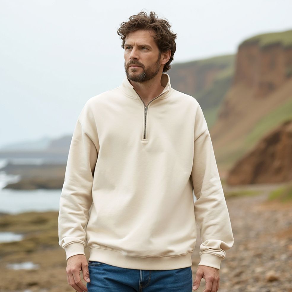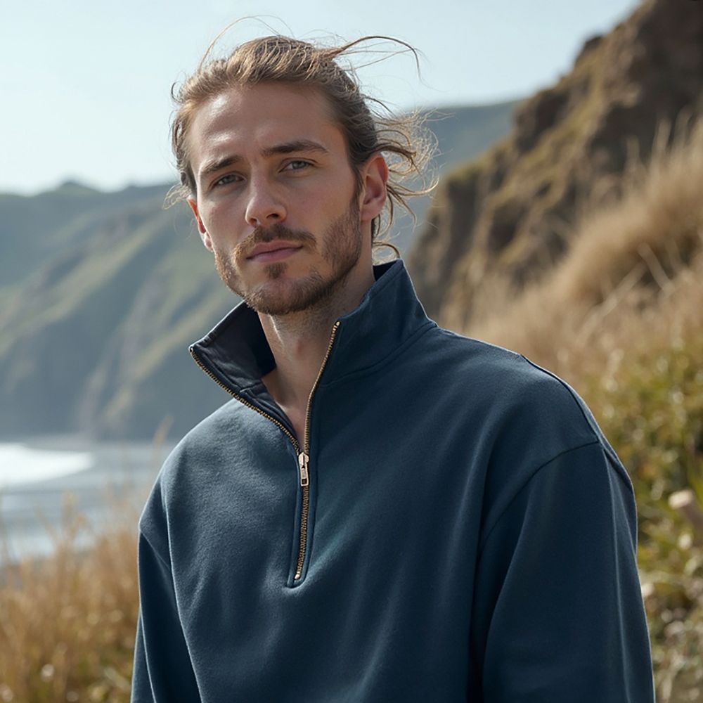 Our organic cotton Men's 1/4 Zip Sweatshirt combines comfort with casual style. This quarter zip pullover features a relaxed fit with dropped shoulders and a funnel neck design for a laid-back look. Made from soft organic cotton with a cosy brushed interior, it's both warm and breathable - perfect for cooler days. The ribbed hem and cuffs provide a snug fit while maintaining that effortless half-zip style that works for any occasion. A versatile addition to your sustainable wardrobe.