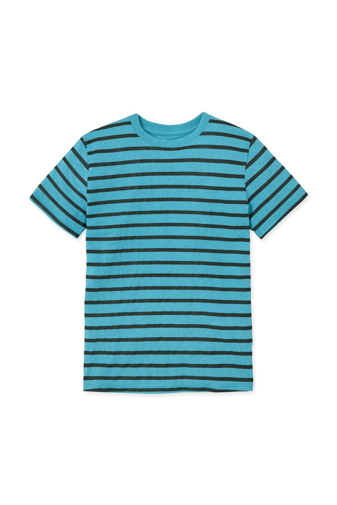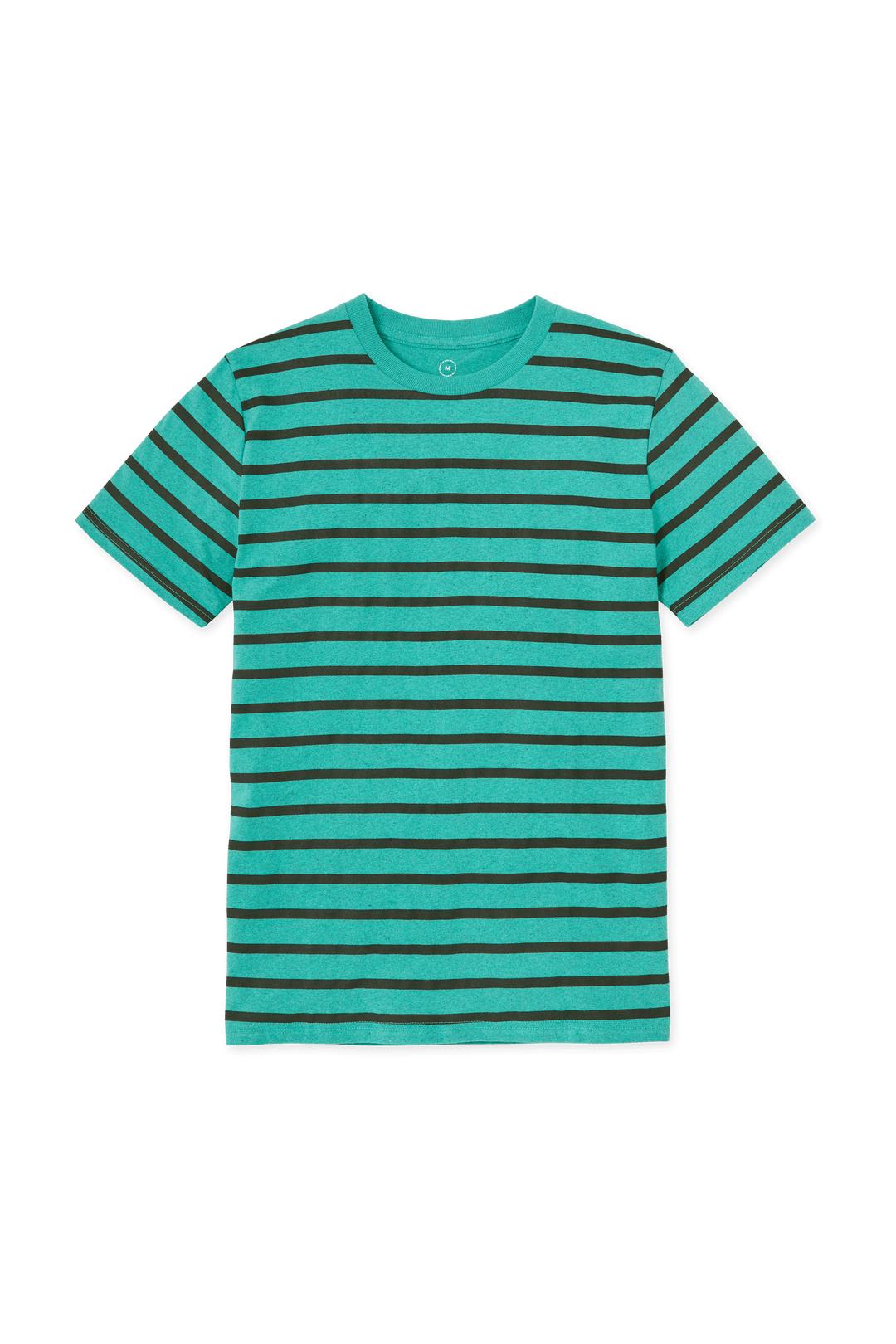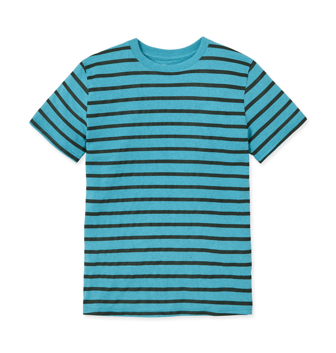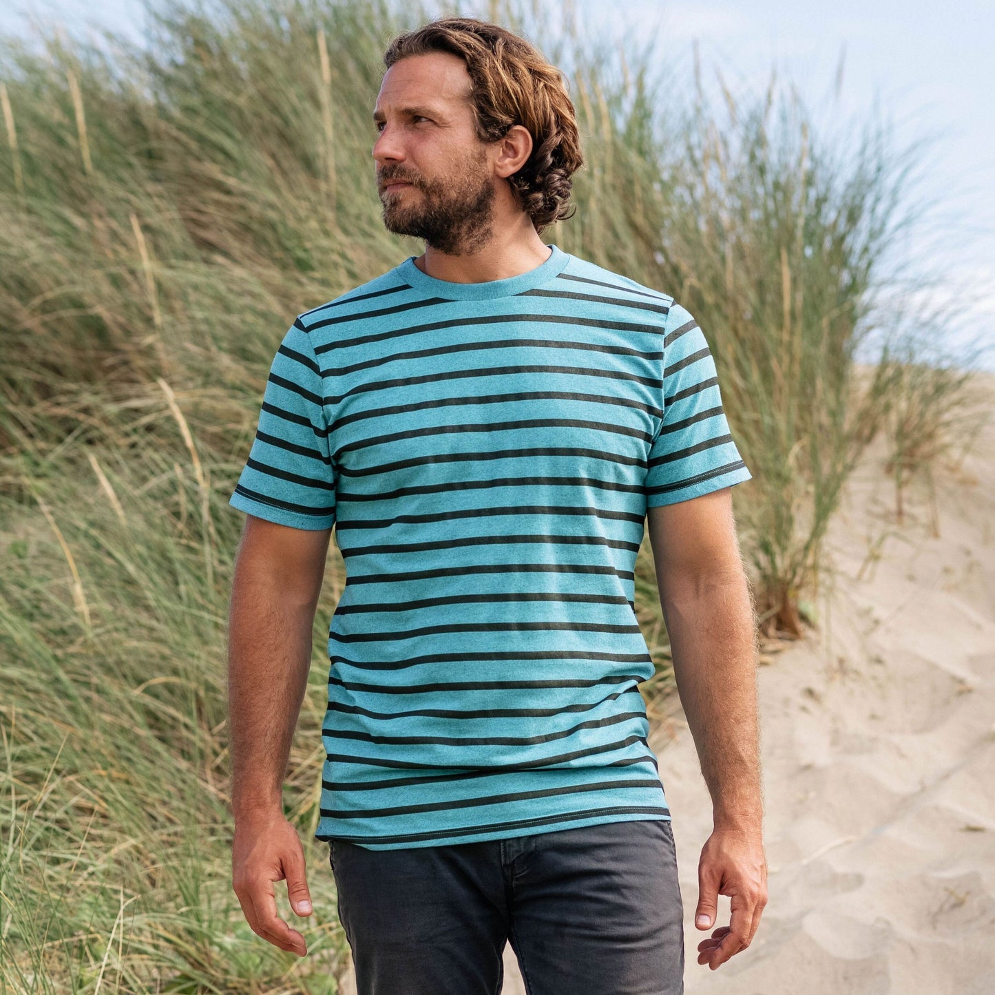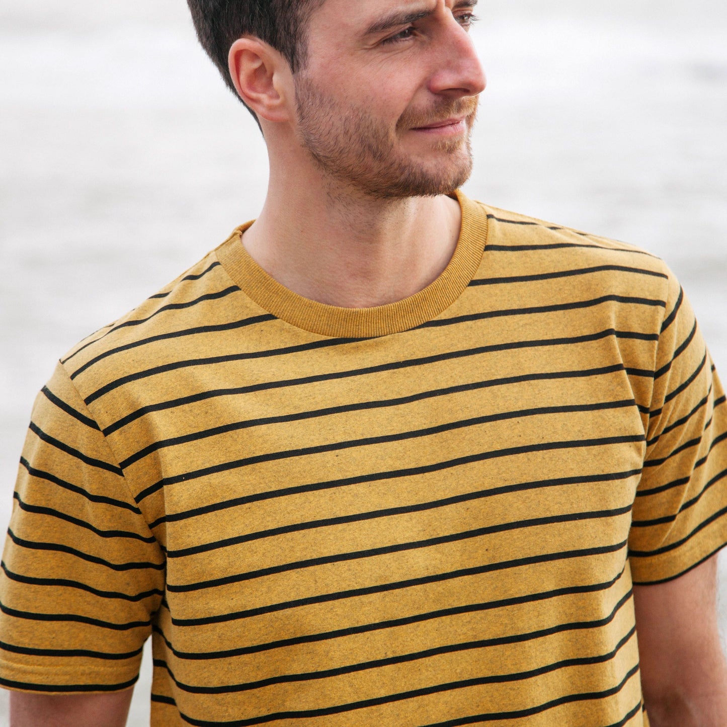 Our Men's Remill Stripe T-Shirt combines style with sustainability. Made from recovered organic cotton through our innovative Remill process, this yellow and navy striped tee gives previously returned materials a new life. The classic stripe pattern offers versatile styling options while the comfortable fit makes it perfect for everyday wear. By choosing this recycled stripe t-shirt, you're helping reduce textile waste and supporting our circular fashion mission.