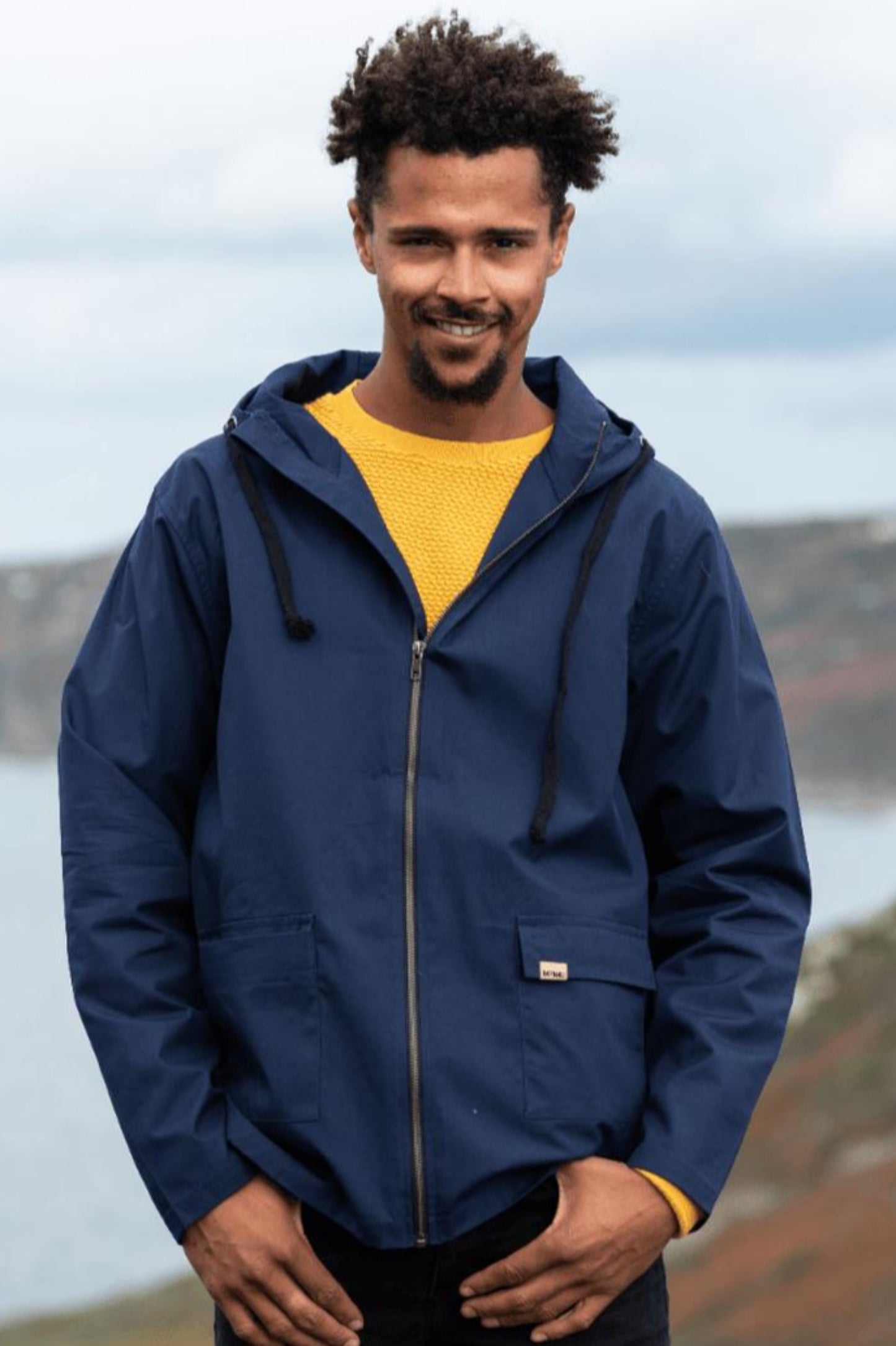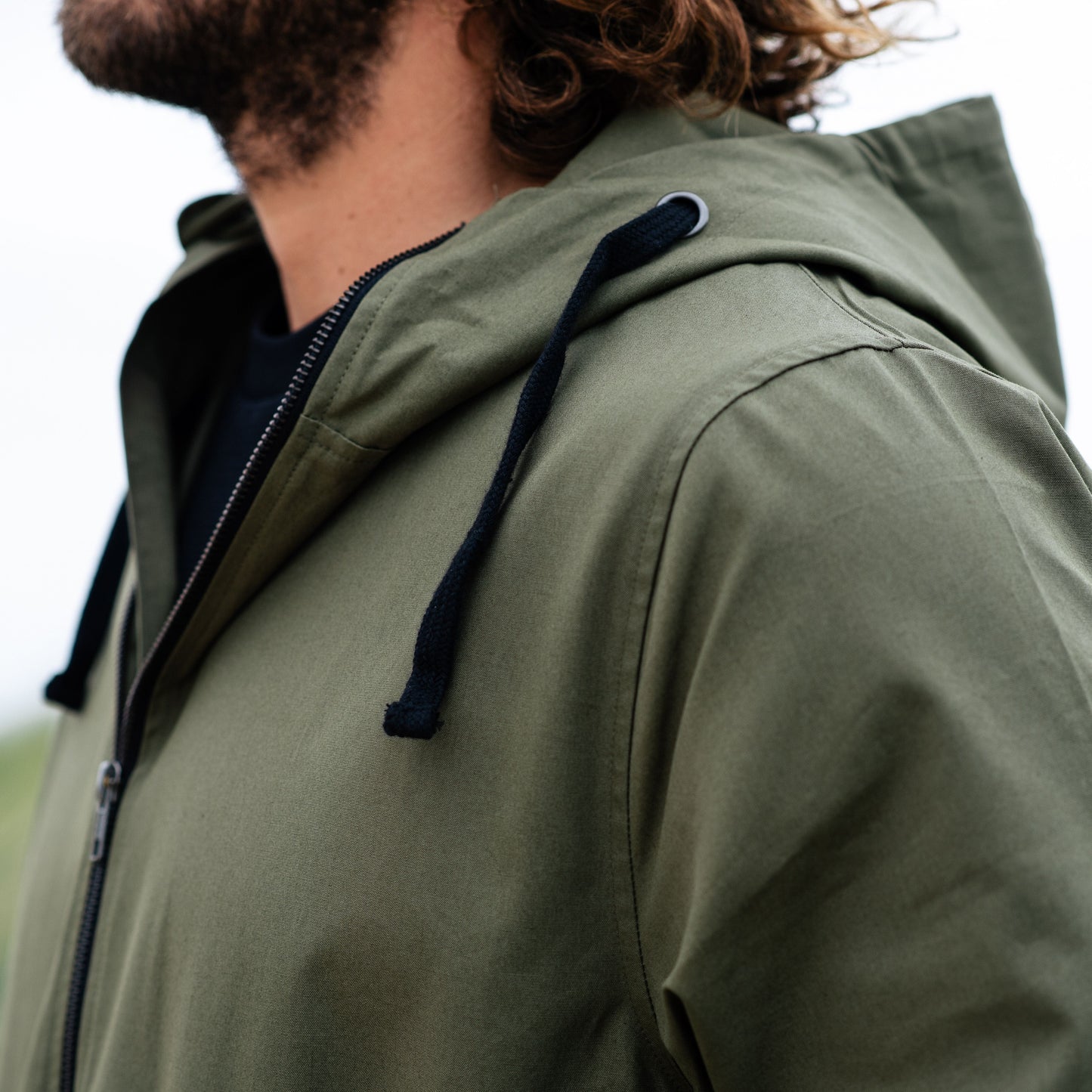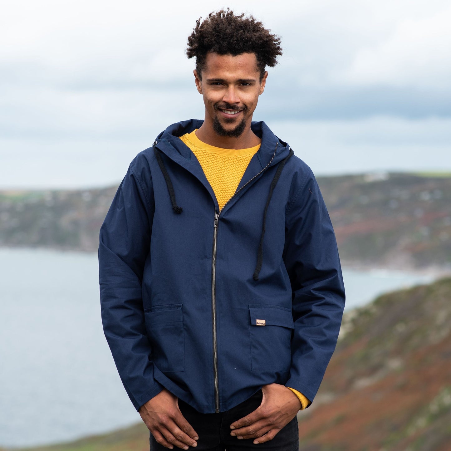 Our Men's Raincoat is designed for all-weather protection, perfect for unpredictable British conditions. Crafted from organic cotton with a PFC-free water-resistant outer layer, this sustainable zip jacket is entirely plastic-free. The adjustable hood and convenient hand pockets enhance functionality, while its compact design makes it ideal for everyday wear. This windproof men's zip-up jacket combines practicality with environmental responsibility - a reliable companion for outdoor adventures without compromising on style or sustainability.