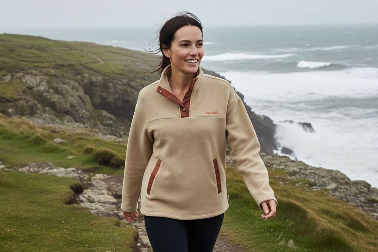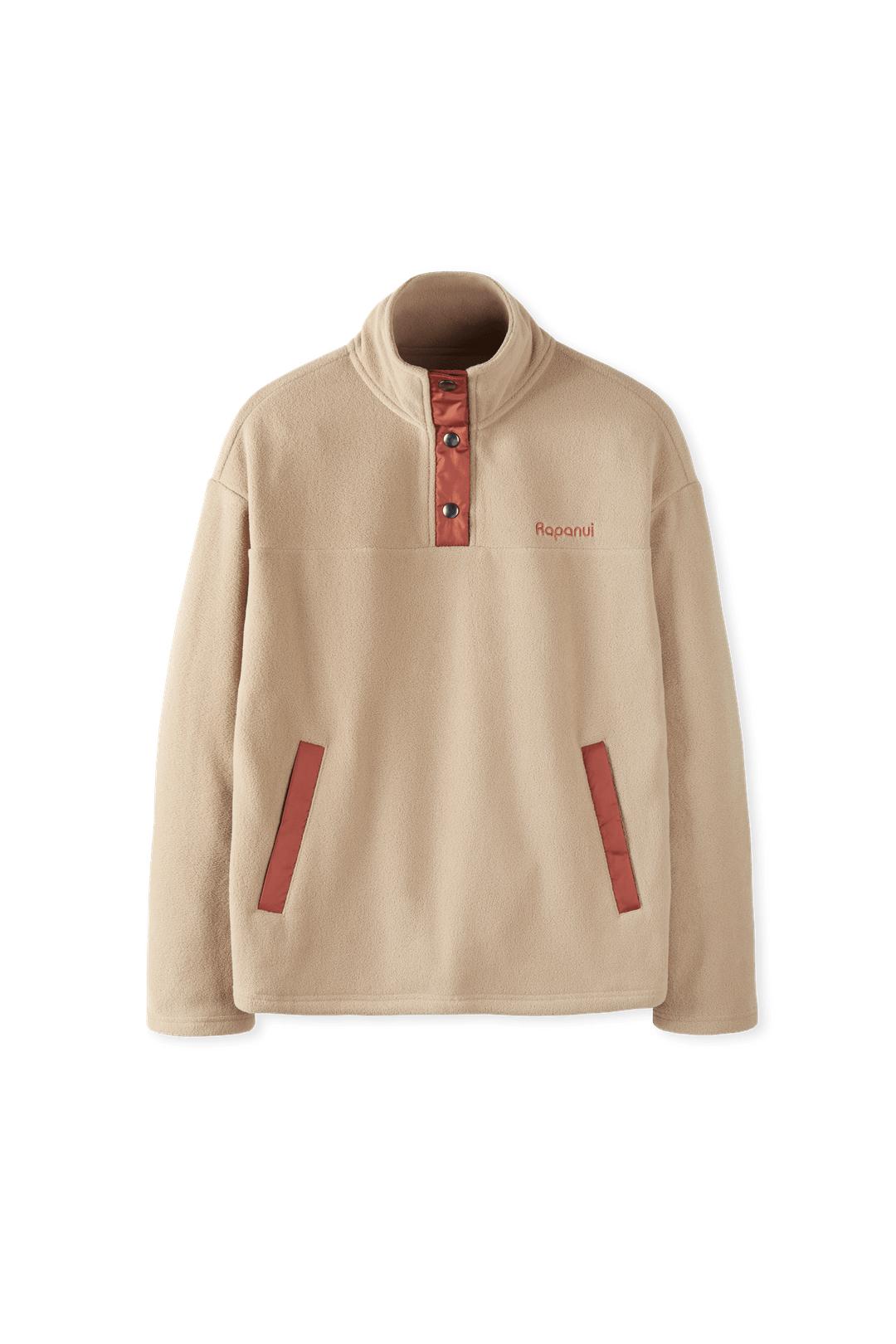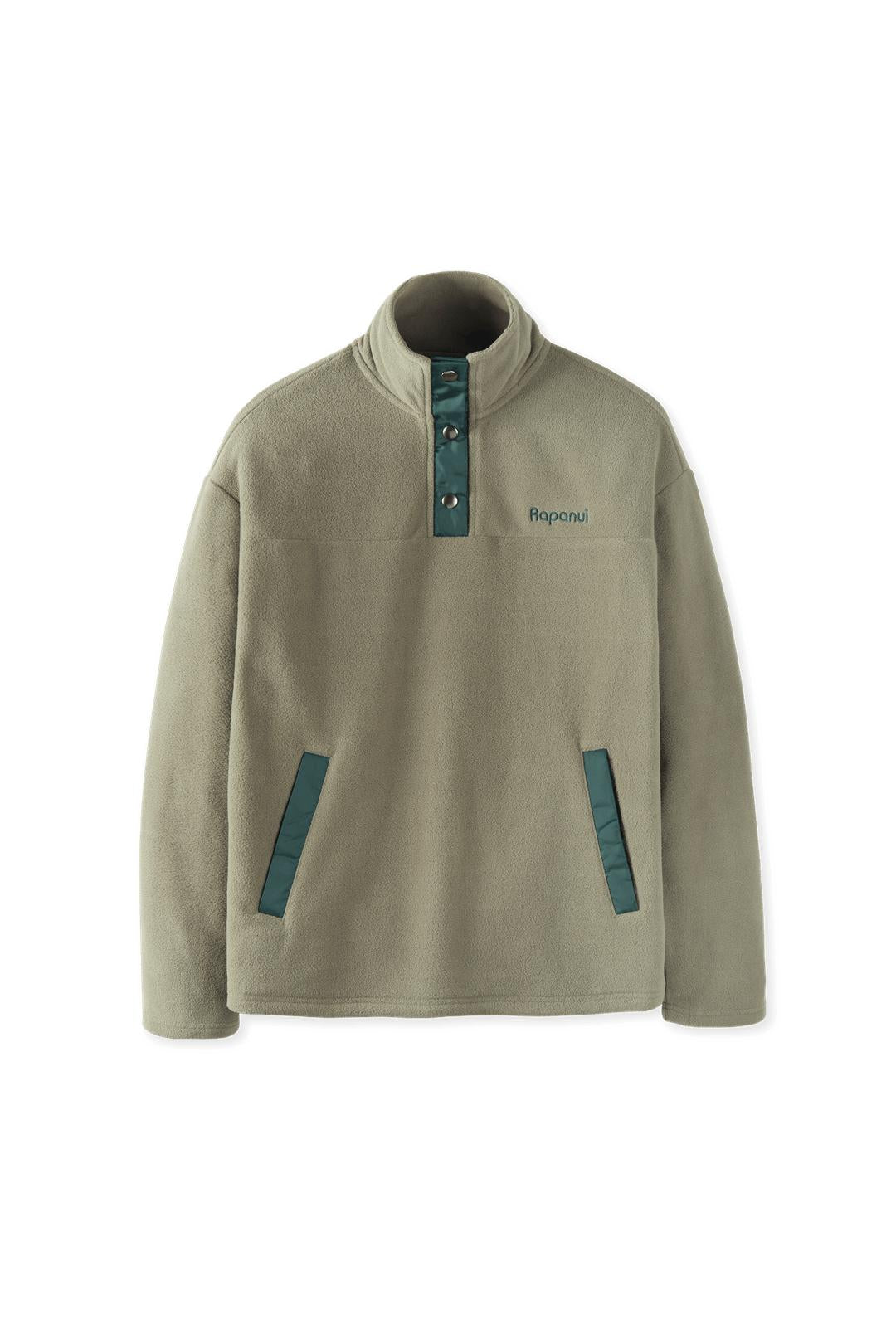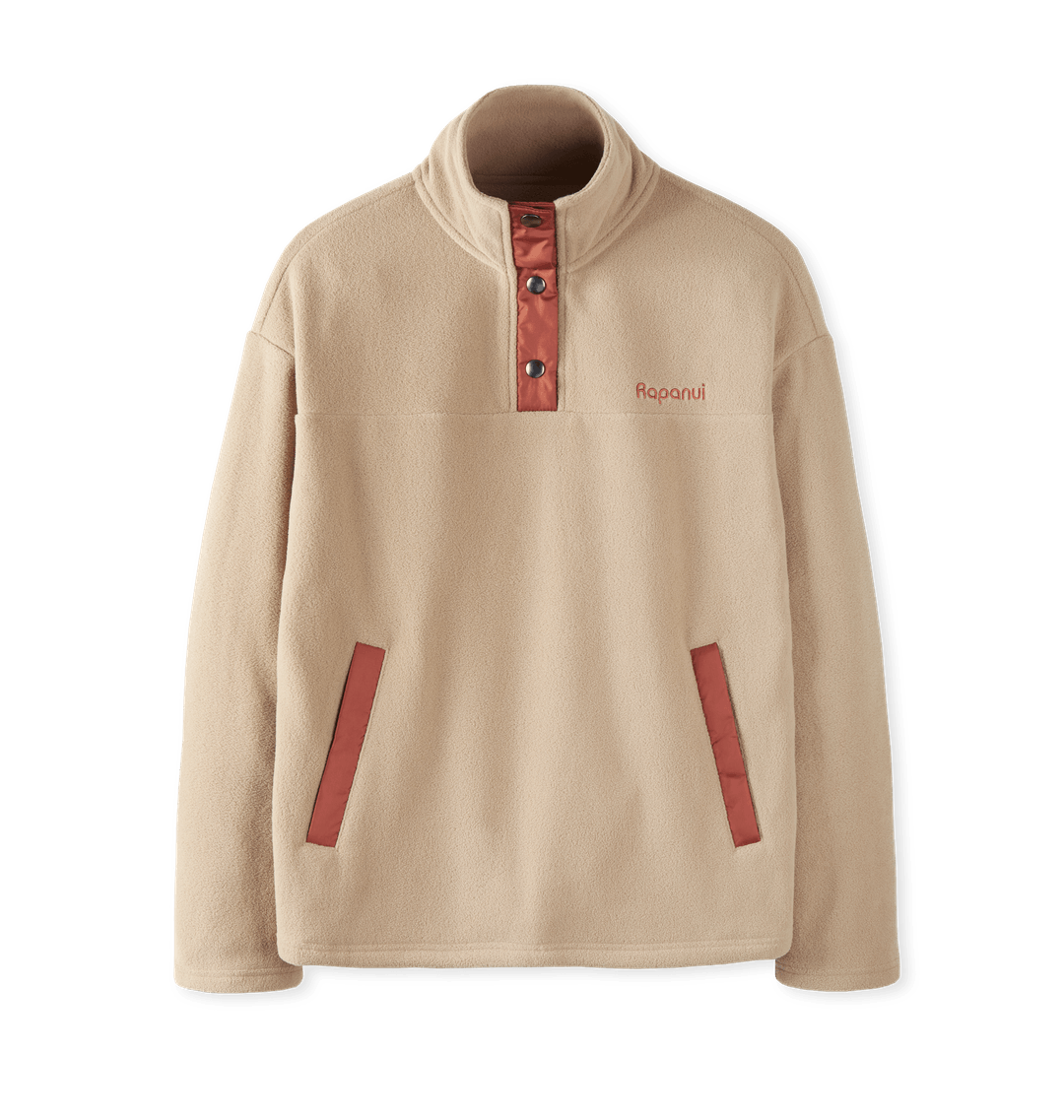 Our Women's Polar Fleece pullover combines warmth with eco-conscious design. Made from 100% recycled polyester, this cozy womens polar fleece features classic snap buttons, an embroidered Rapanui logo, and practical side pockets. Perfect for layering on chilly adventures, this women's polar fleece jumper offers sustainable comfort without compromising on style.