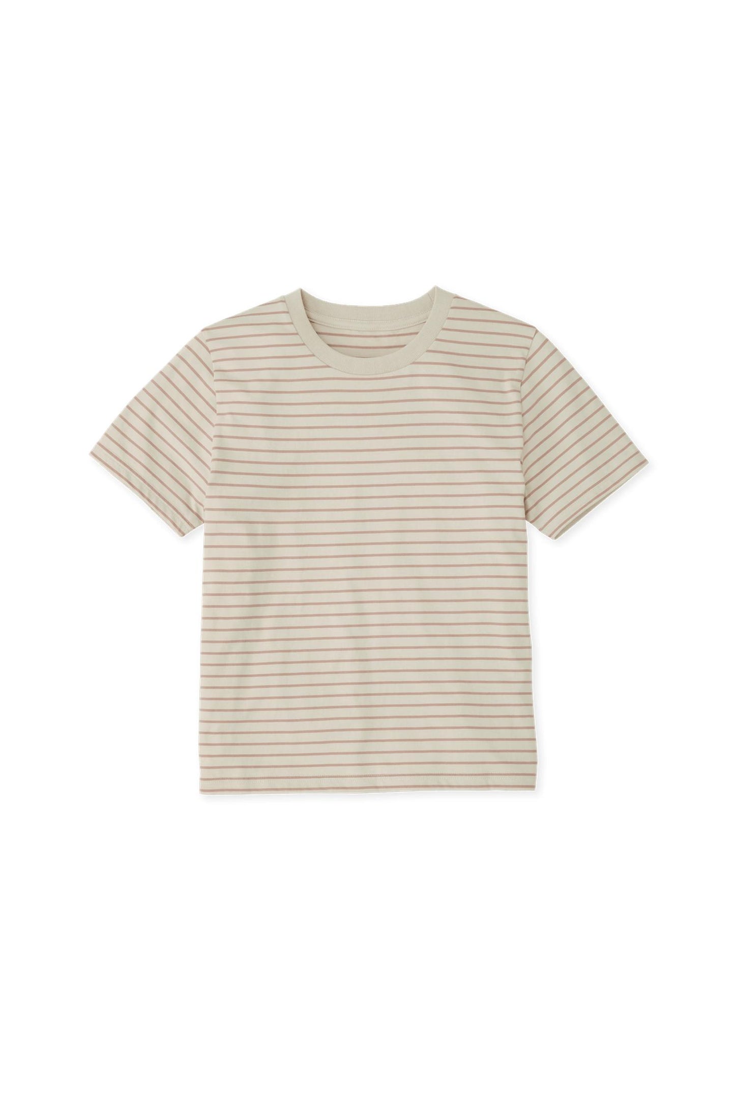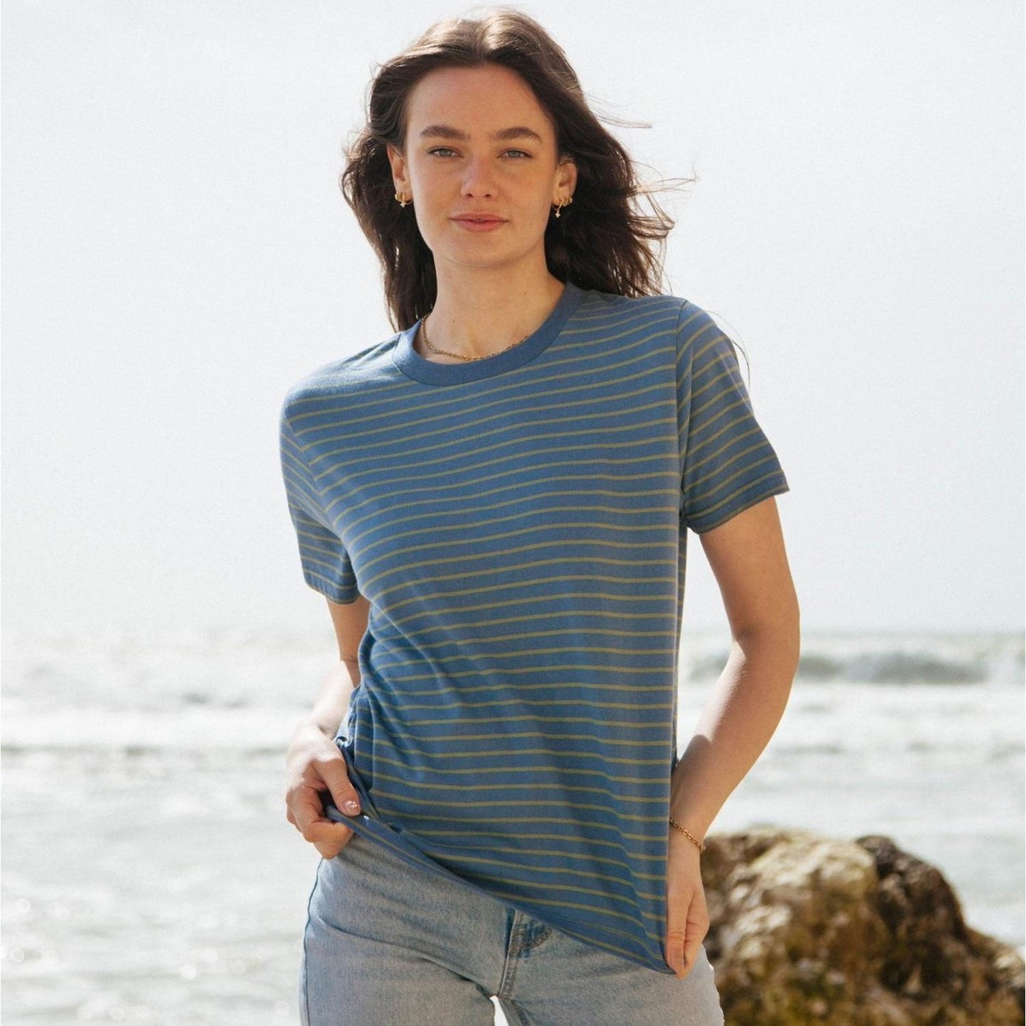 Our Women's Striped T-Shirt blends classic nautical style with sustainable comfort. Made from soft organic cotton, this versatile striped t-shirt for ladies features a relaxed fit and sun-washed blue and green tones. Perfect for casual everyday wear, this ladies striped tee pairs beautifully with jeans or shorts for an effortless island-inspired look. Add this timeless women's striped t-shirt to your wardrobe for a sustainable style statement that never goes out of fashion.