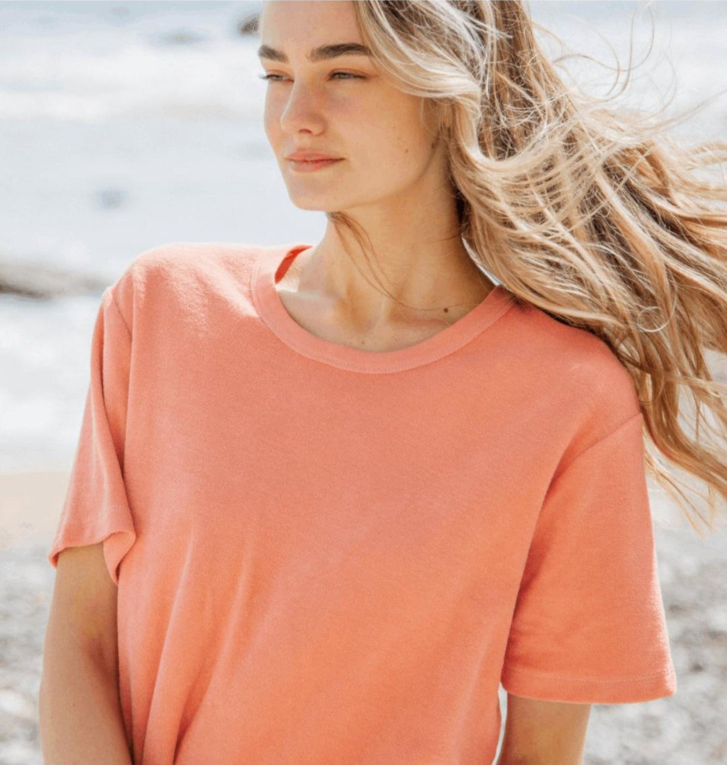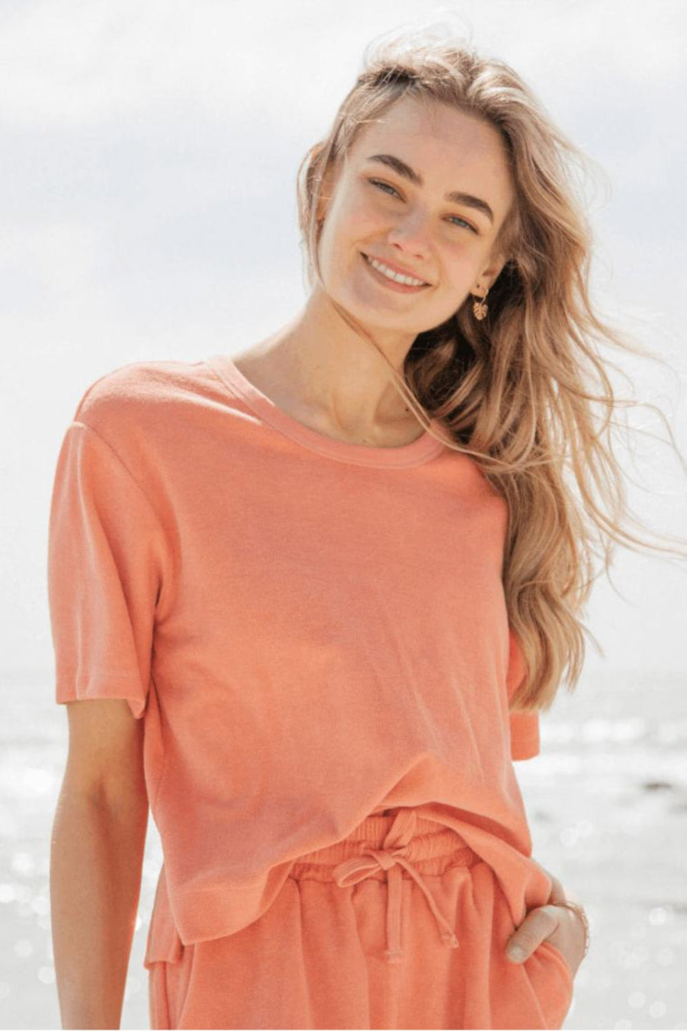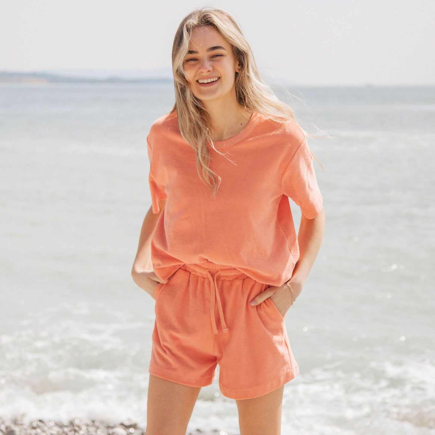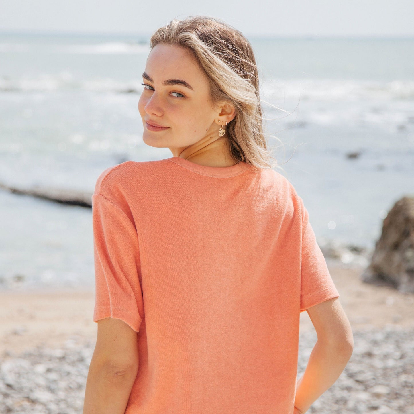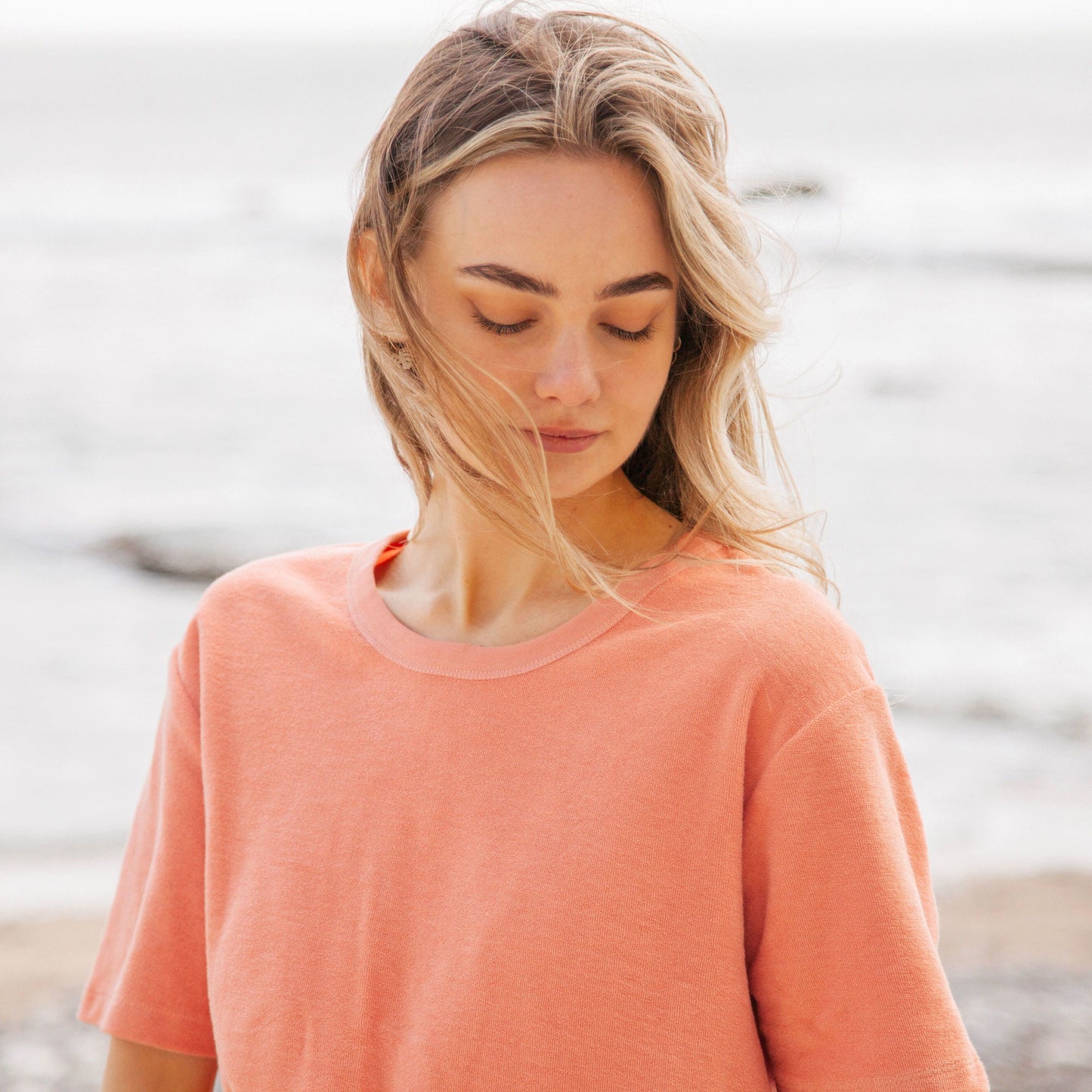 Our Women's Towelling T-Shirt combines soft organic cotton with coastal comfort. Perfect for post-swim coverage or everyday wear, this towelling top features a relaxed fit and breathable fabric in a beautiful coral shade. The lightweight towel t-shirt transitions effortlessly from beach days to casual outings, making it a versatile addition to your sustainable wardrobe. Made with care from eco-conscious materials, this towelling tee embodies our commitment to quality and planet-friendly fashion.