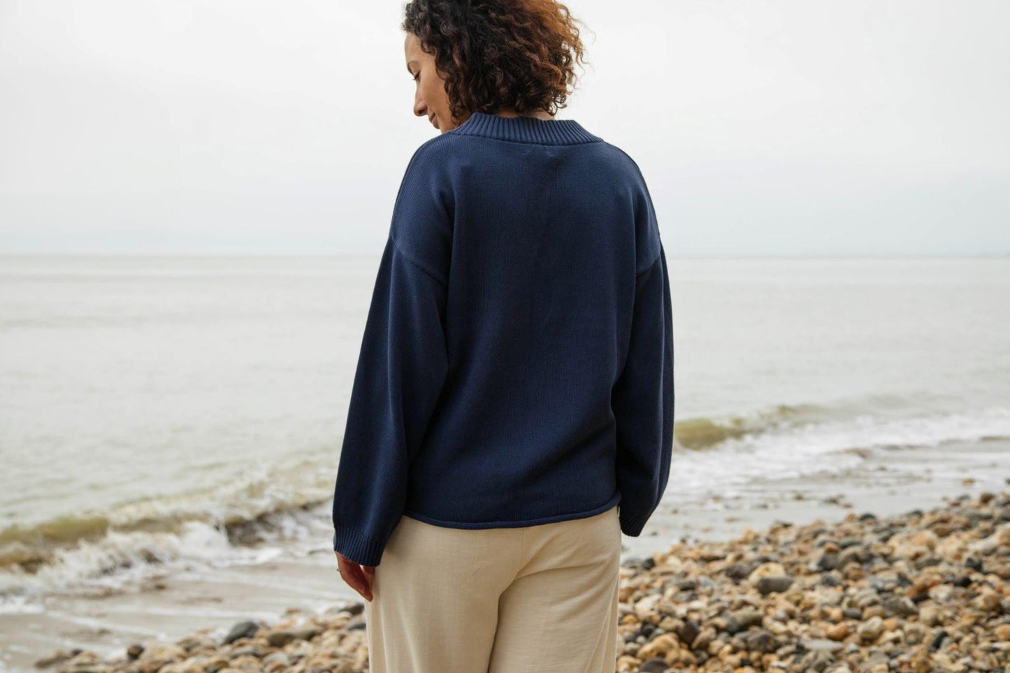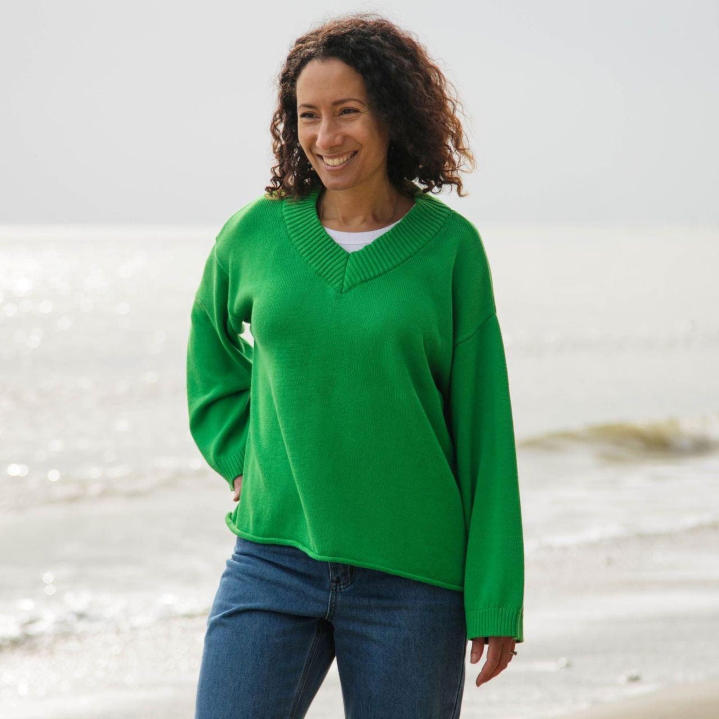 Our Women's V-Neck Jumper combines comfort with conscious design, crafted from 100% organic cotton in a soft, medium-weight knit. The oversized fit and ribbed v-neck design create a modern, relaxed silhouette that's perfect for effortless layering year-round. This versatile v-neck sweater features a rolled hem for an easygoing touch, making it a timeless staple in any sustainable wardrobe. Ideal for casual styling or dressed-up looks, this women's v-neck knitwear piece transitions seamlessly between seasons.