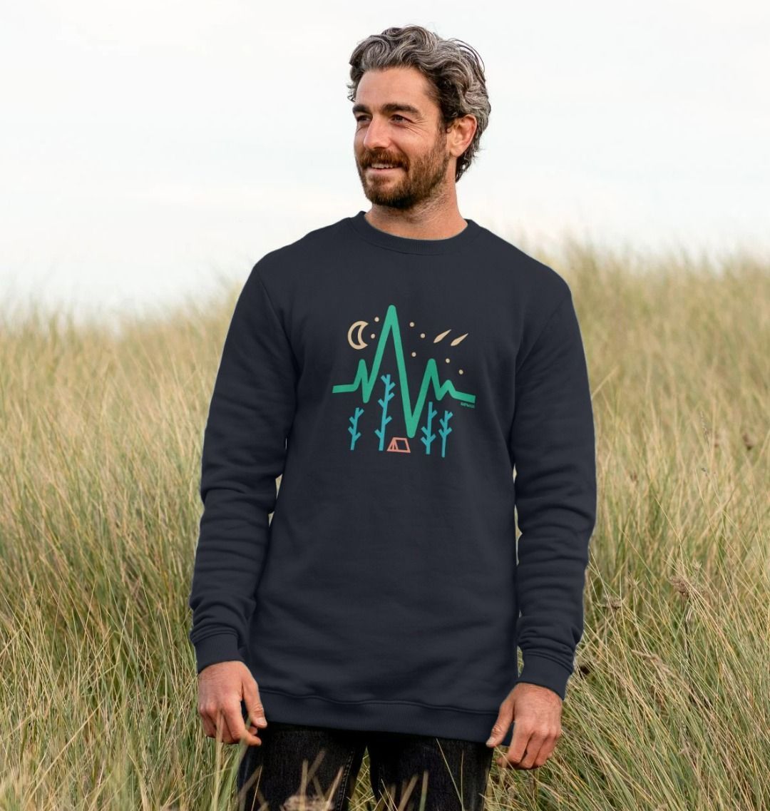 Our Heartbeat Sweatshirt combines comfort with adventure, featuring a unique mountain pulse design with forest and camping elements. Made from soft, sustainable materials, this navy sweatshirt celebrates the rhythm of outdoor life with its striking turquoise heartbeat line and celestial details. Perfect for nature lovers and outdoor enthusiasts who want to showcase their connection to the wilderness while staying cozy on evening adventures.