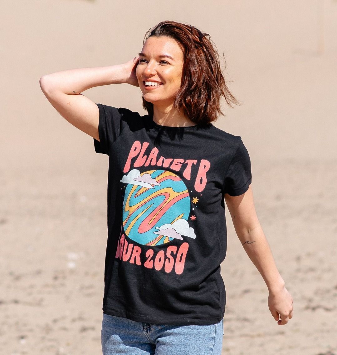 Express yourself with our Women's Planet B Tour T-shirt, featuring a vibrant retro design inspired by cosmic adventure. Made from organic cotton and printed on demand in the UK, this statement tee combines sustainable style with festival-ready vibes. The relaxed fit and soft fabric make it perfect for everyday wear or making a statement at your next gig. There's no Planet B, so join the tour with this eye-catching cosmic t-shirt.